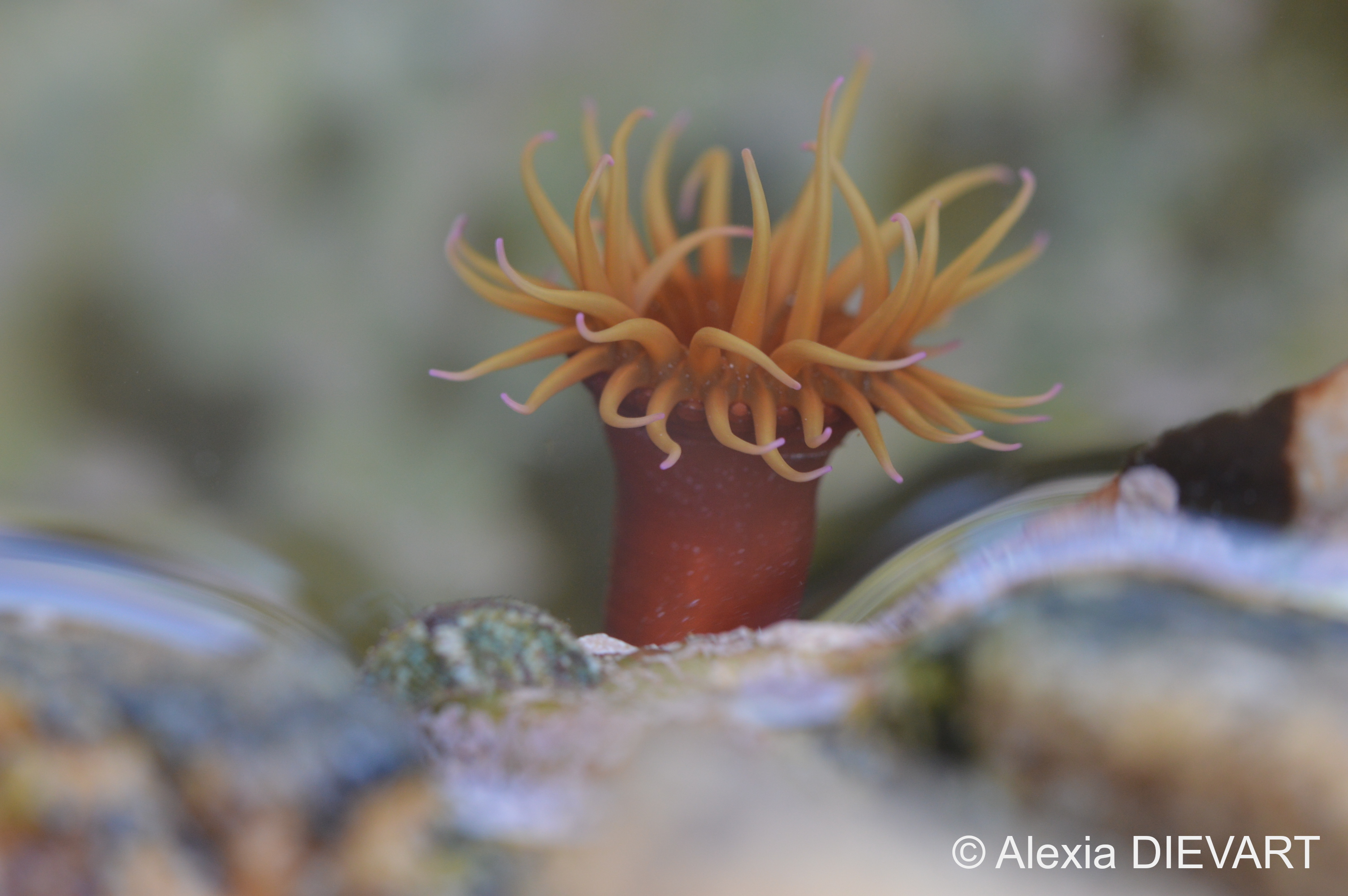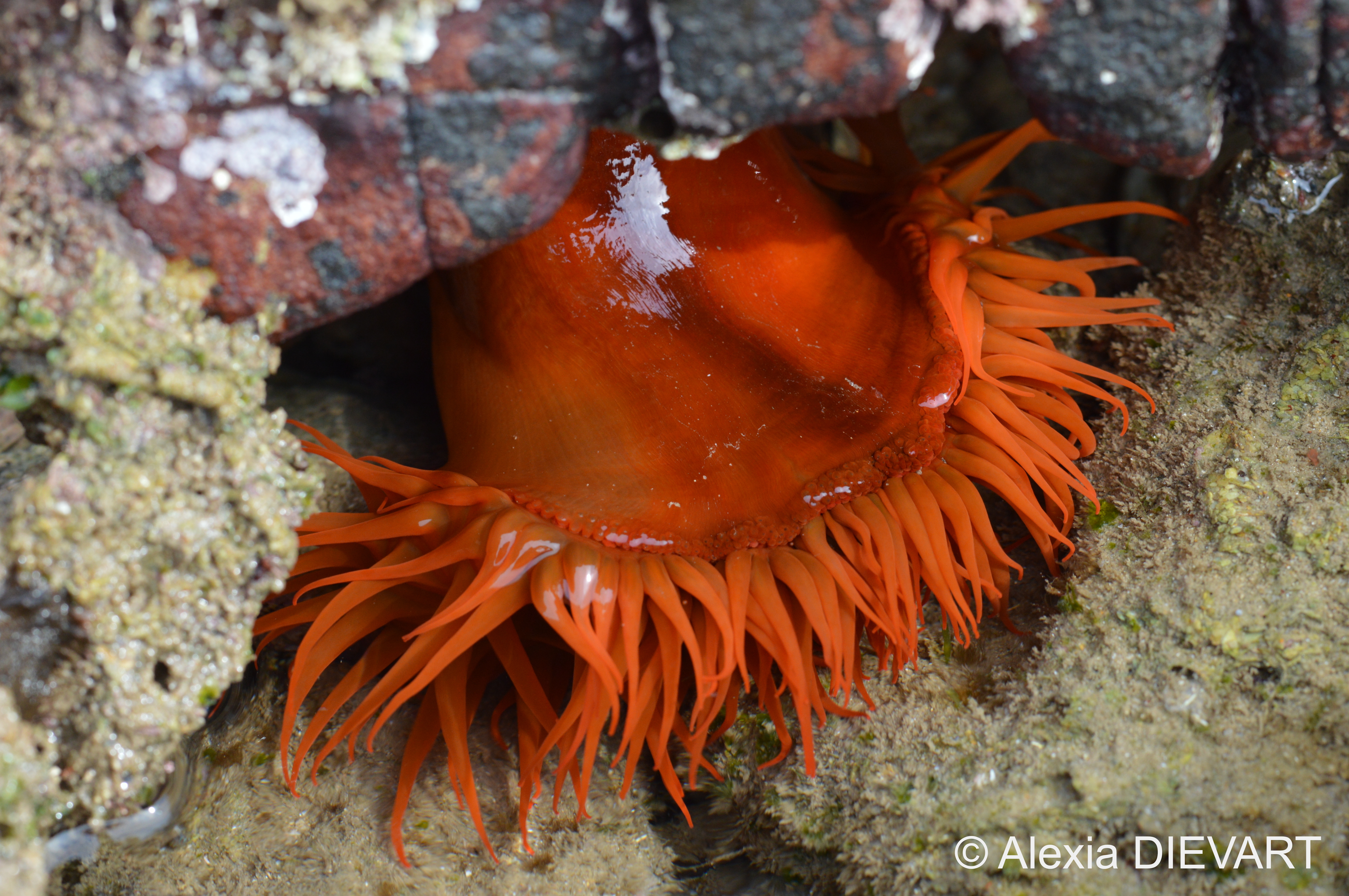 Column smooth, orange to red, tentacles red or yellow, often mauve-tipped. Cannot readily retract tentacles or close up. 3-5 rows of bubble-like, orange vesicles and one row of spherules just outside tentacles.