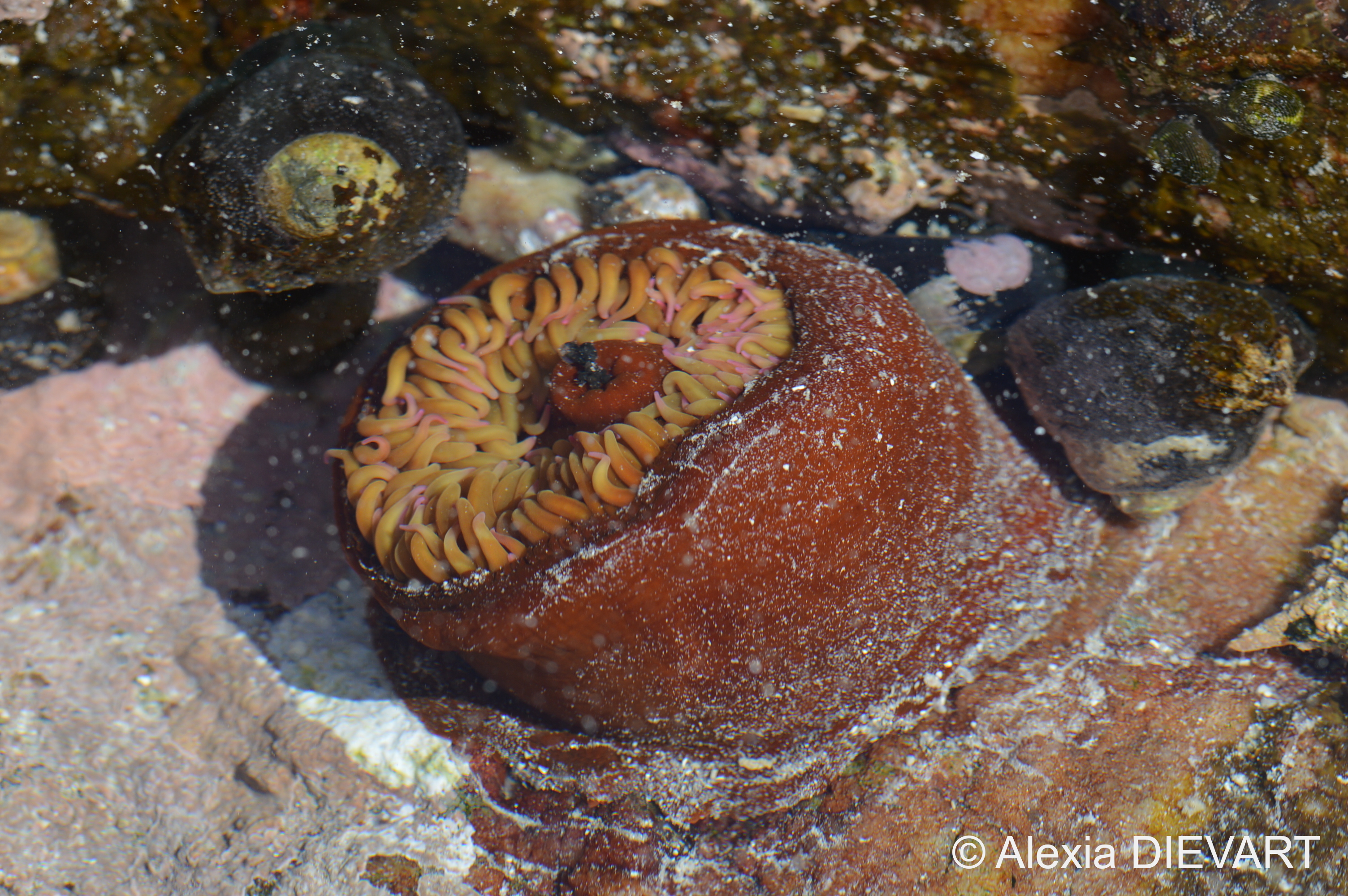 From Saldanha Bay to East London, Pseudactinia varia can also be present, although smaller (about 20 mm) and with only 1-2 rows of vesicles. An undescribed species has the column mottled white and can be found from Cape Peninsula to Aliwal Shoal.