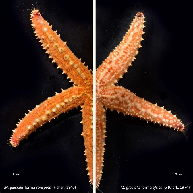 Furthermore, the distribution of the spine armament differs between the two species: M. glacialis has numerous, slightly spaced, blunt spines arranged in three or more regular rows down the length of each arm, whereas M. africana can either have an extraordinarily bare surface with only two spine rows per arm, or be covered in many irregularly spaced spines (Wright et al. 2016).