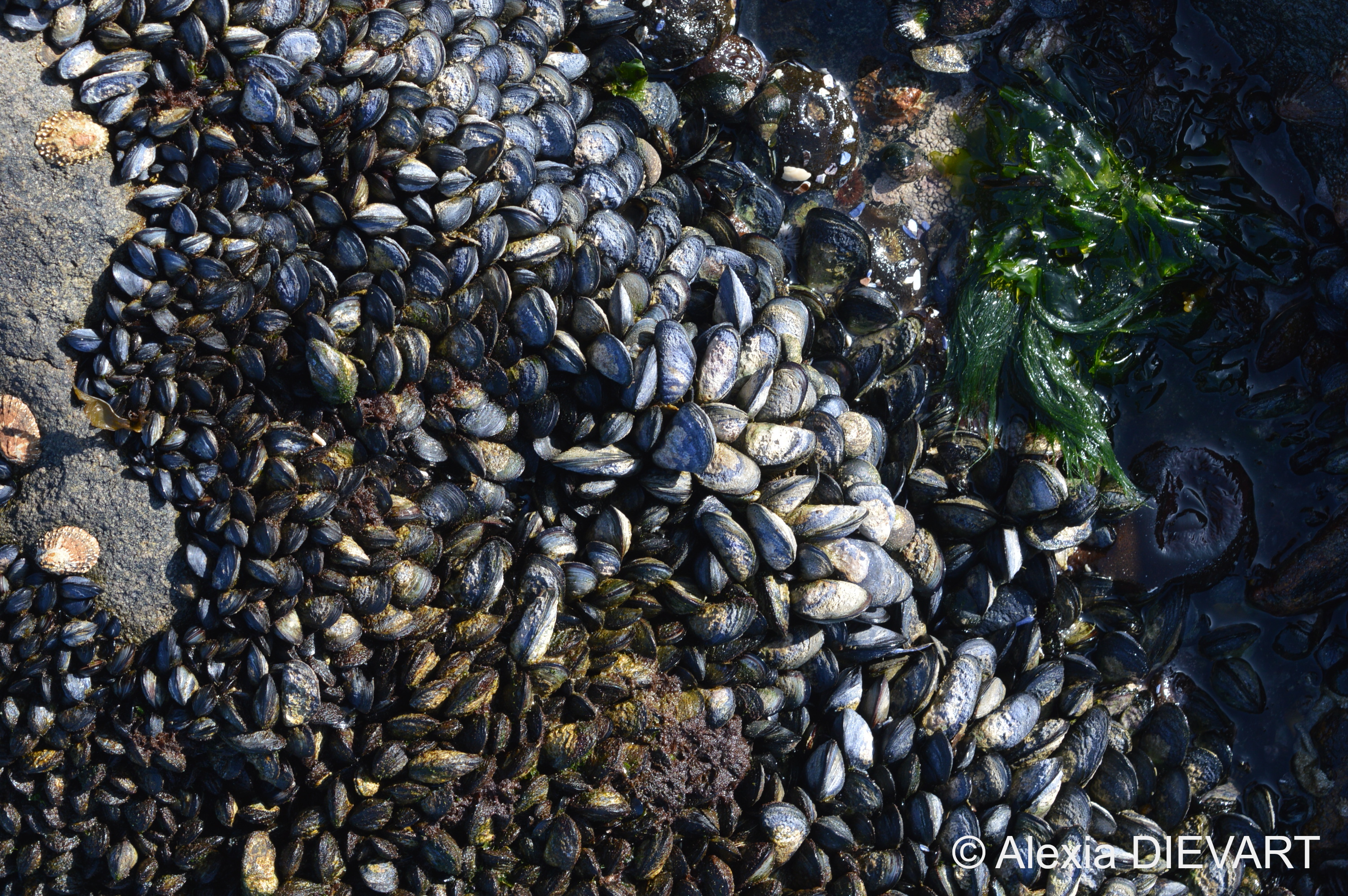 Thought to be a recent introduction from Europe, around the 1970s, but now the dominant intertidal mussel throughout the West Coast, often forming a dense band in the low intertidal. Rare below water. The flesh of females is orange and of male is off-white. A fast-growing mussel raised commercially.