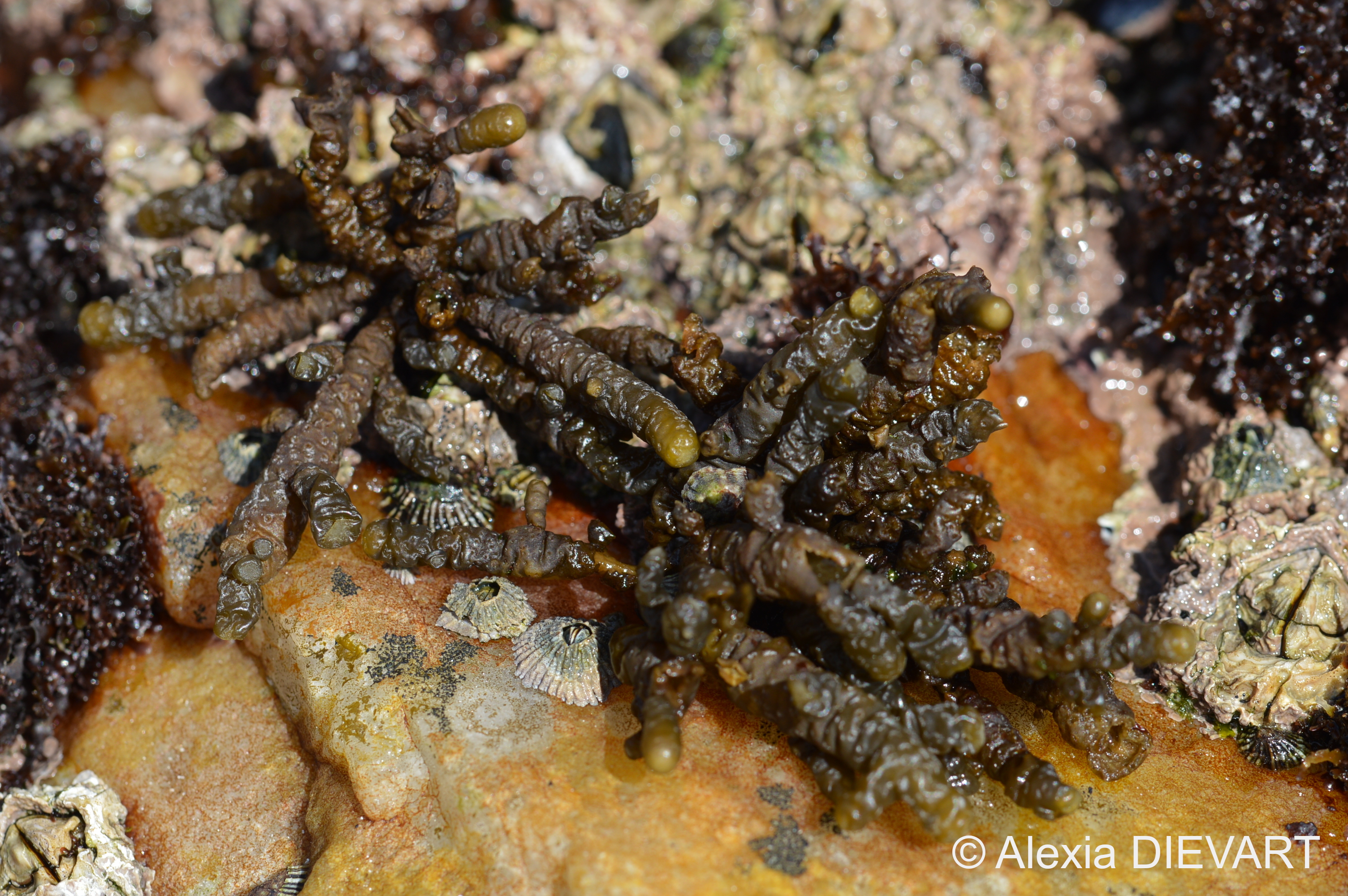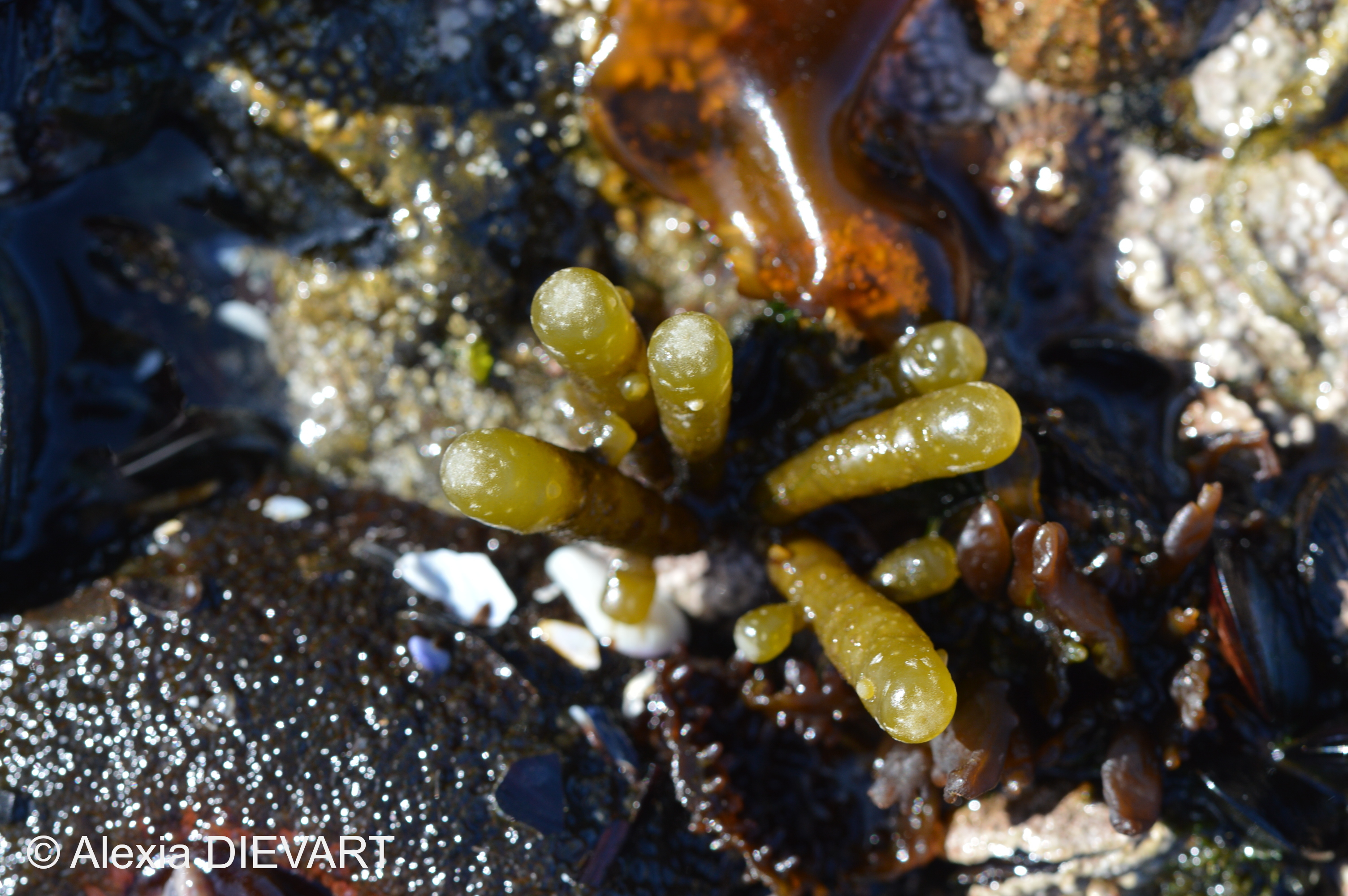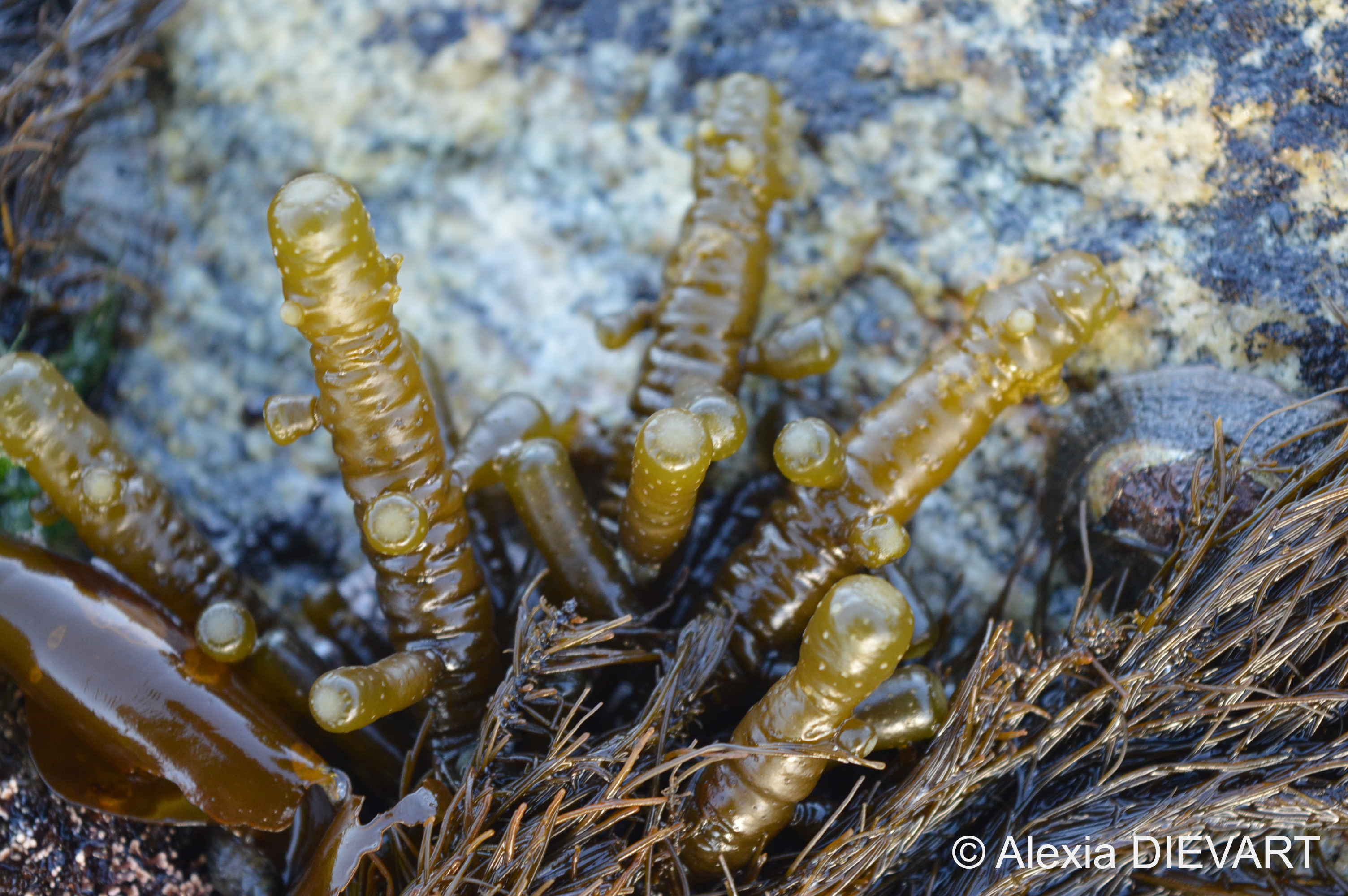 Swollen yellow-brown, finger-like bladders, filled with thick, clear slimy mucilage, turgid when wet and becoming withered and wrinkled when dry. The main stipe is swollen with many similarly shaped side branches which are constricted at their point of origin and rounded at the tips. The holdfast is a small disc from which several stipes may arise. The texture is turgid and firm becoming leathery with age.
