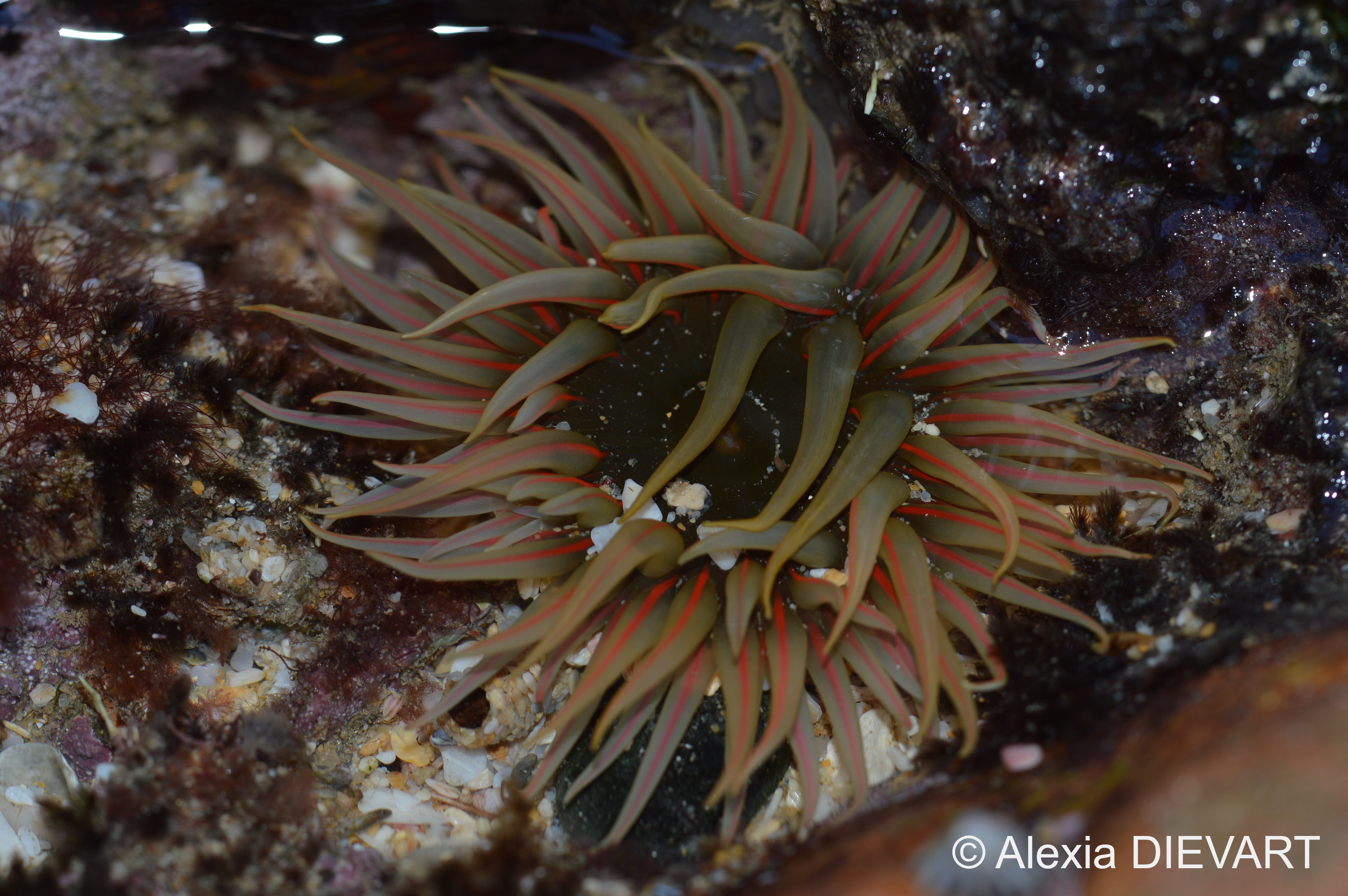 Crevice anemones come in very different colors, which could mislead their identification. The following specimens have a faint red line at the center of each of their brownish tentacles, in comparison with the specimens presented above, that have lightly-colored tentacles (i.e., cream, transparent with white horizontal lines) with a pink line in the middle.