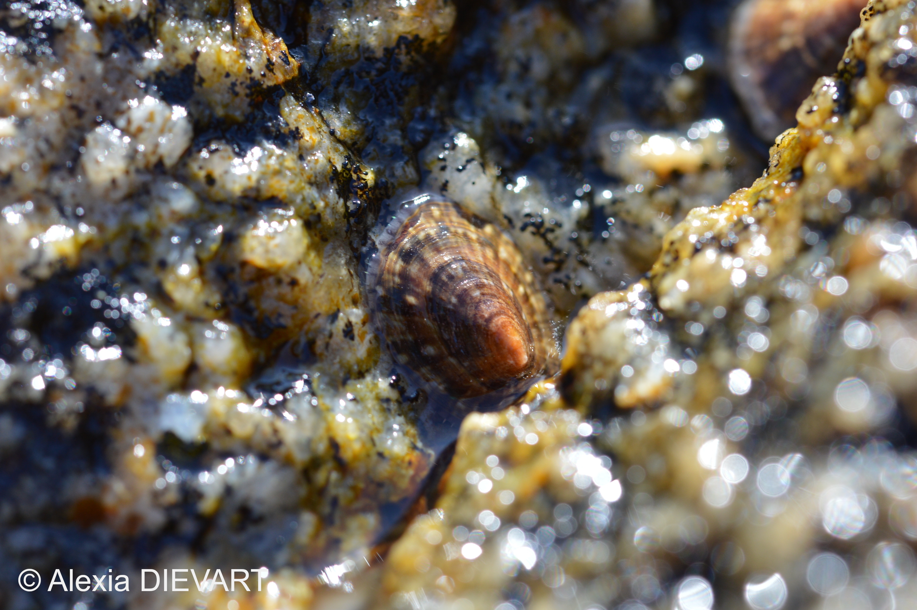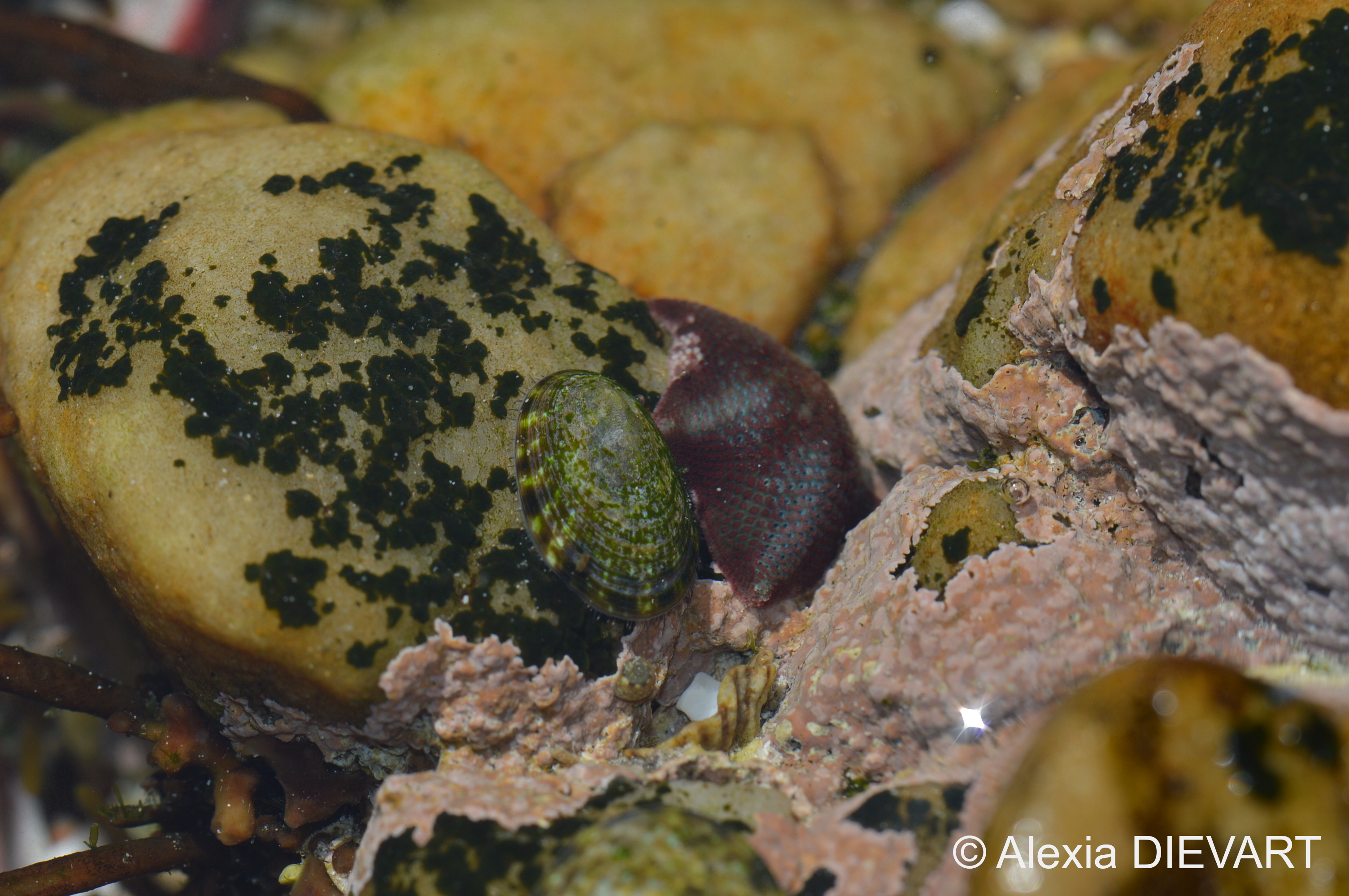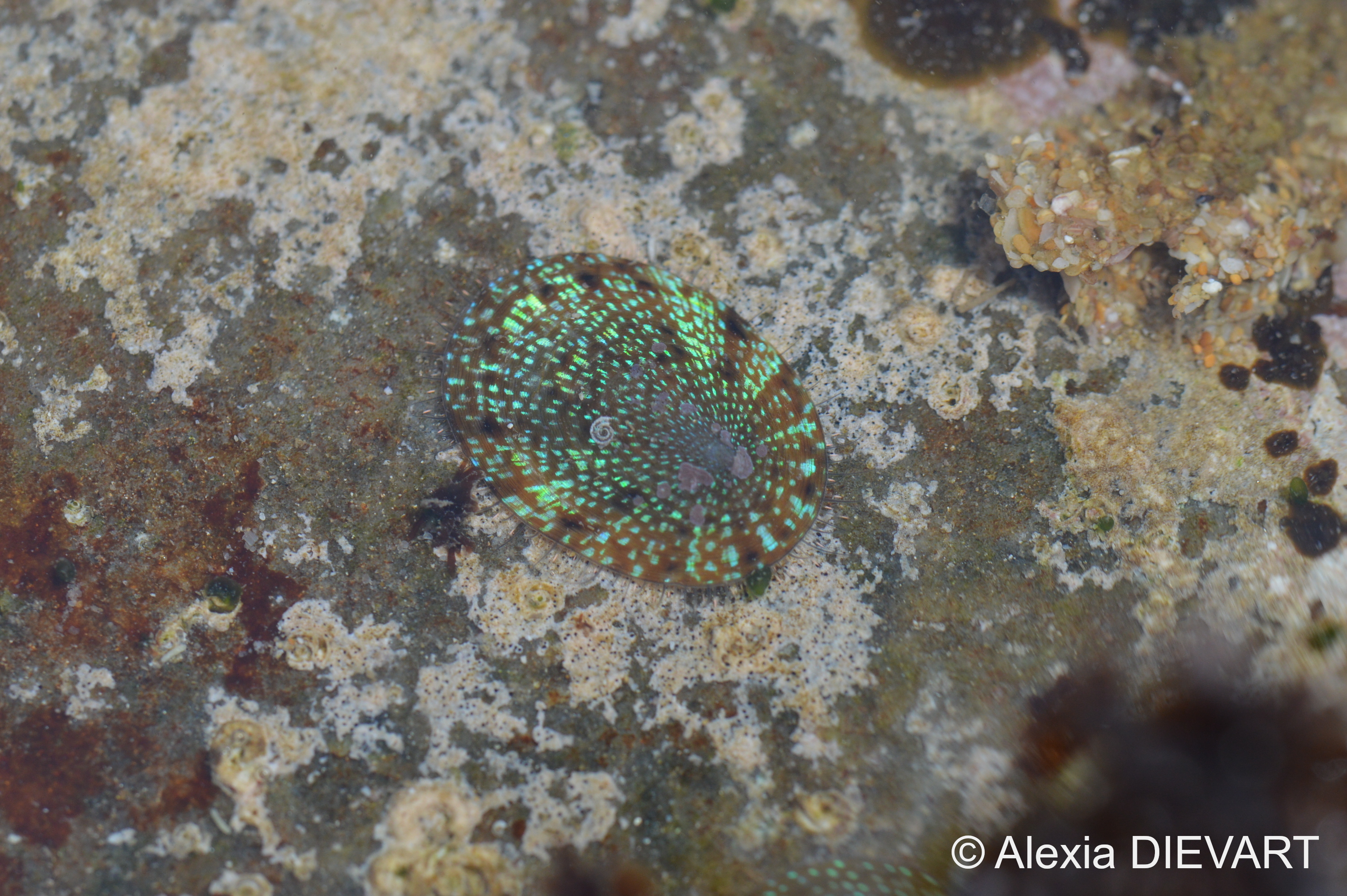 Shell low, fragile and oval. Apex about one-third from the front margin. Surface smooth, pale brown, shot with beautiful iridescent green spots and rays.