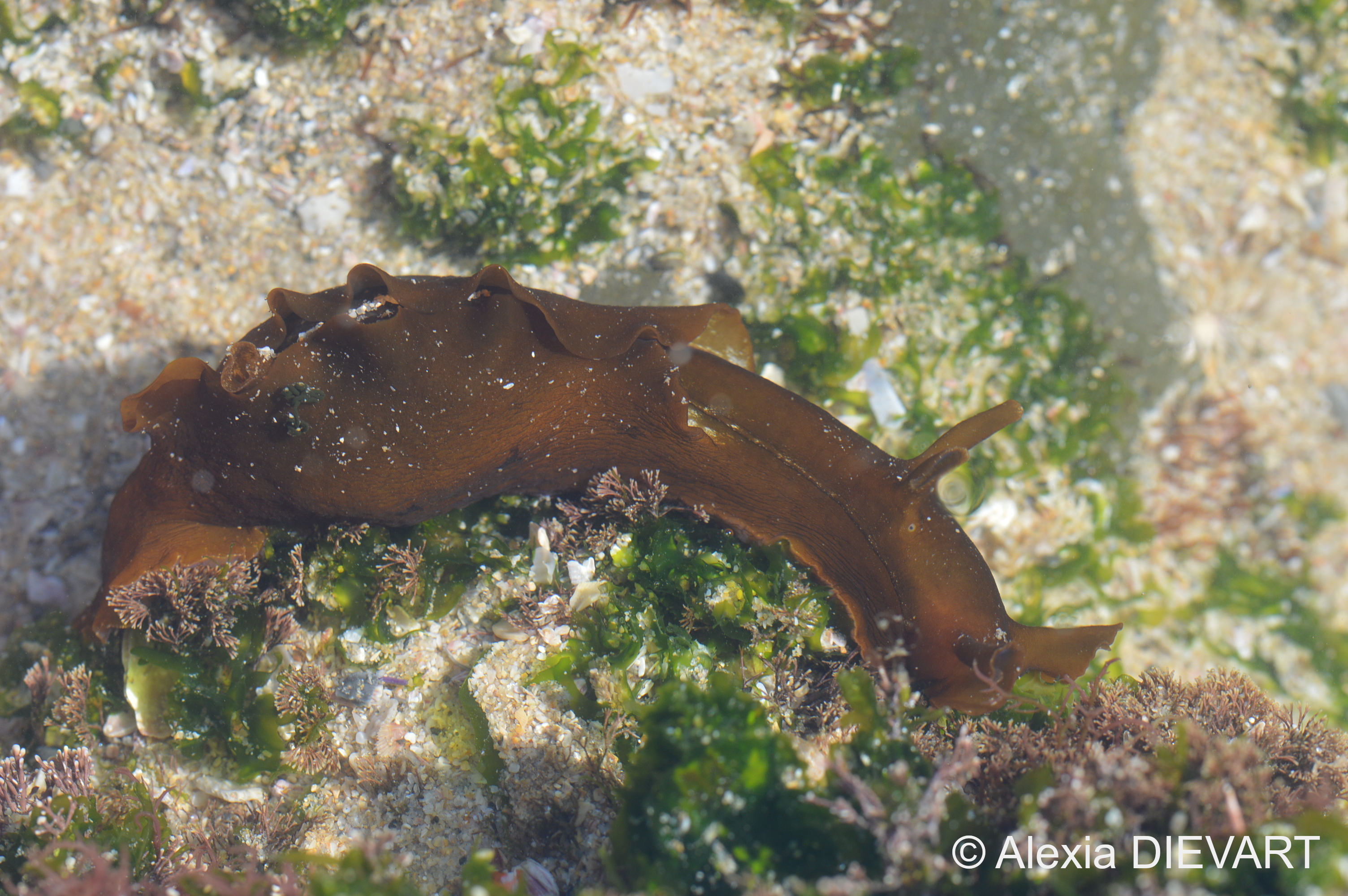 A typical smooth-skinned sea hare with prominent tentacles and ear-like rhinophores. Plain brown or with tiny white dots.