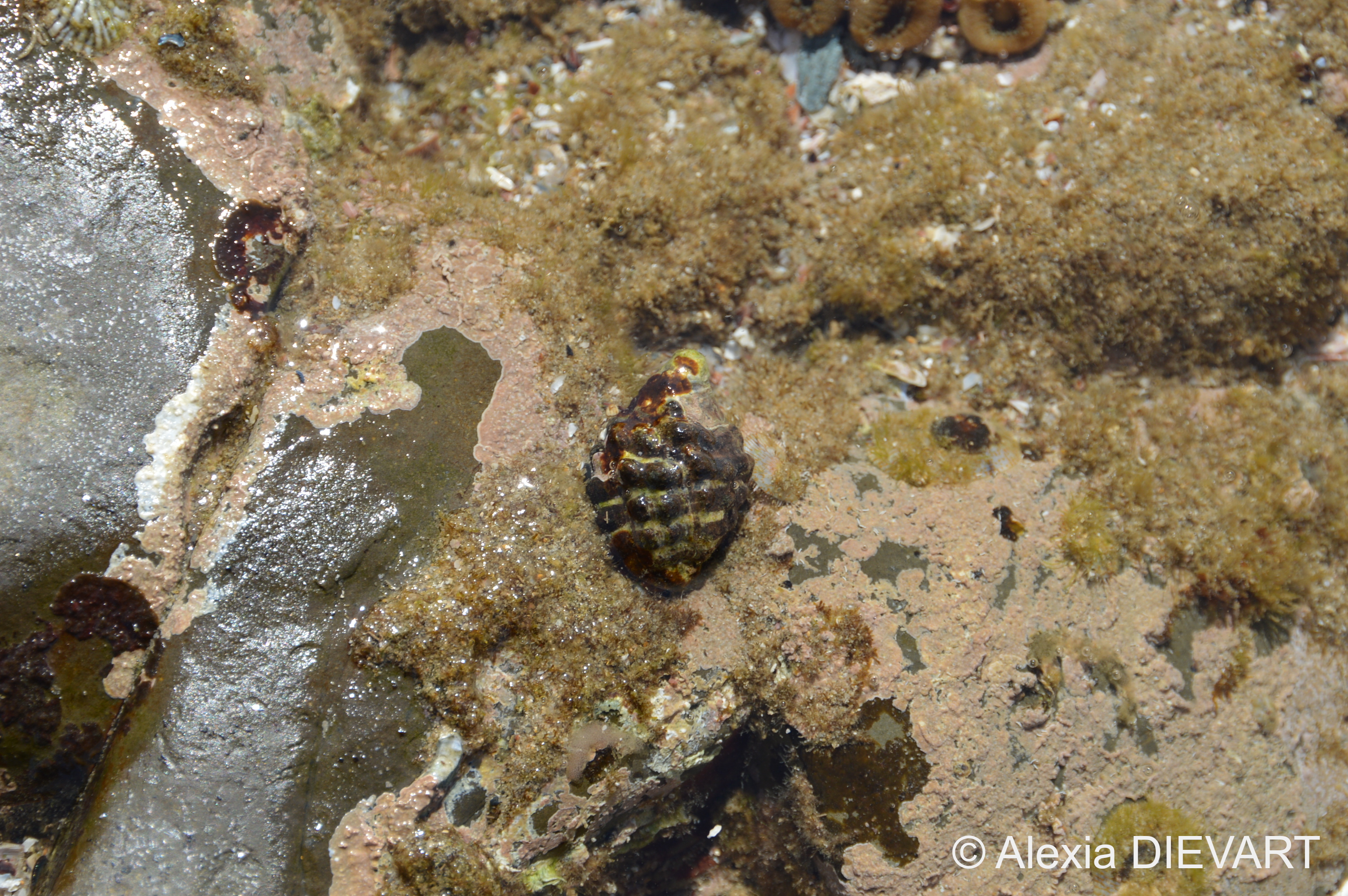 Hides under rocks in low-shore pools or shallow waters. Eats sea squirts (ascidians) by pushing its proboscis down their siphons, but will feed on gastropods as well.