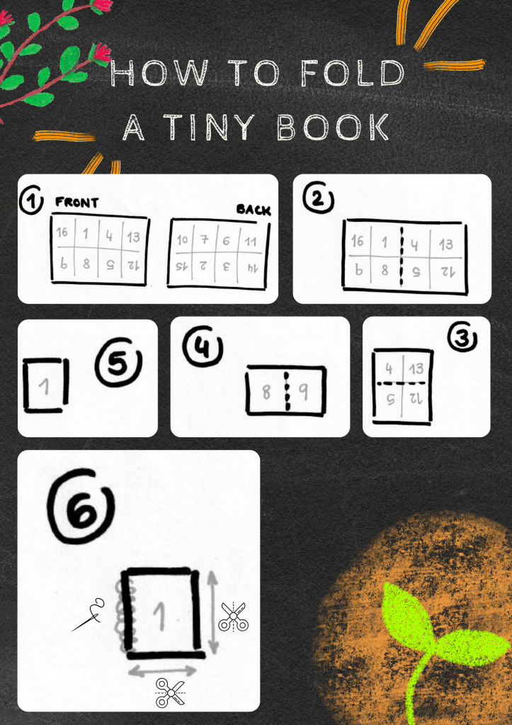 In essence, a tiny book is an A4 piece of paper, somehow folded to created a 16-pages book, including the cover. You won’t believe how simple it is !