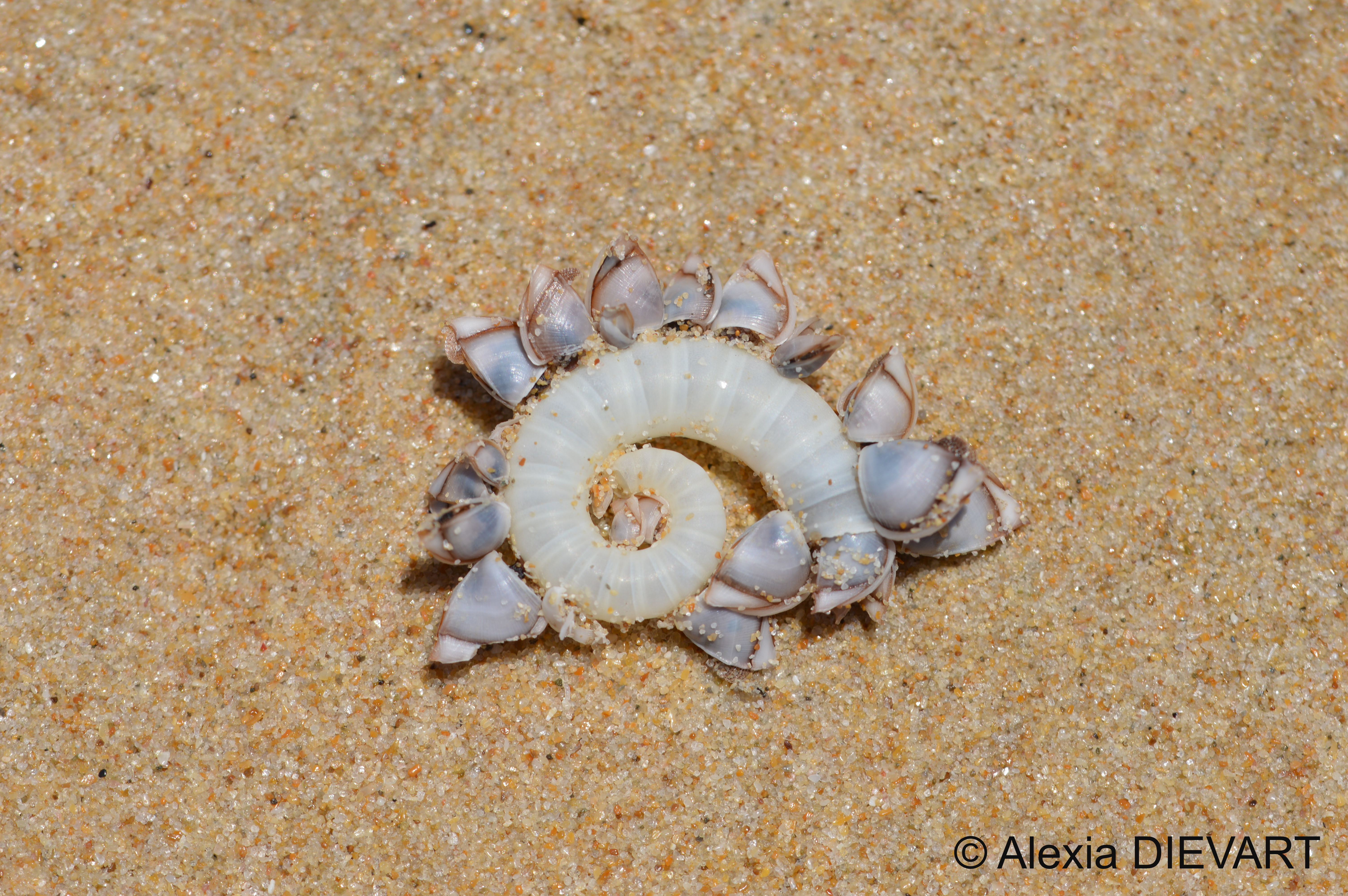Although small in numbers, colonies of small goose barnacles (Lepas pectinata) prefer to attach themselves to small objects, and have a specific fondness for ram’s horn shells (Spirula spirula) (Whitehead et al. 2011). They are also found on feathers, on Sargassum in the western Atlantic ocean, and on tar pellets and small plastic pieces in Ireland.