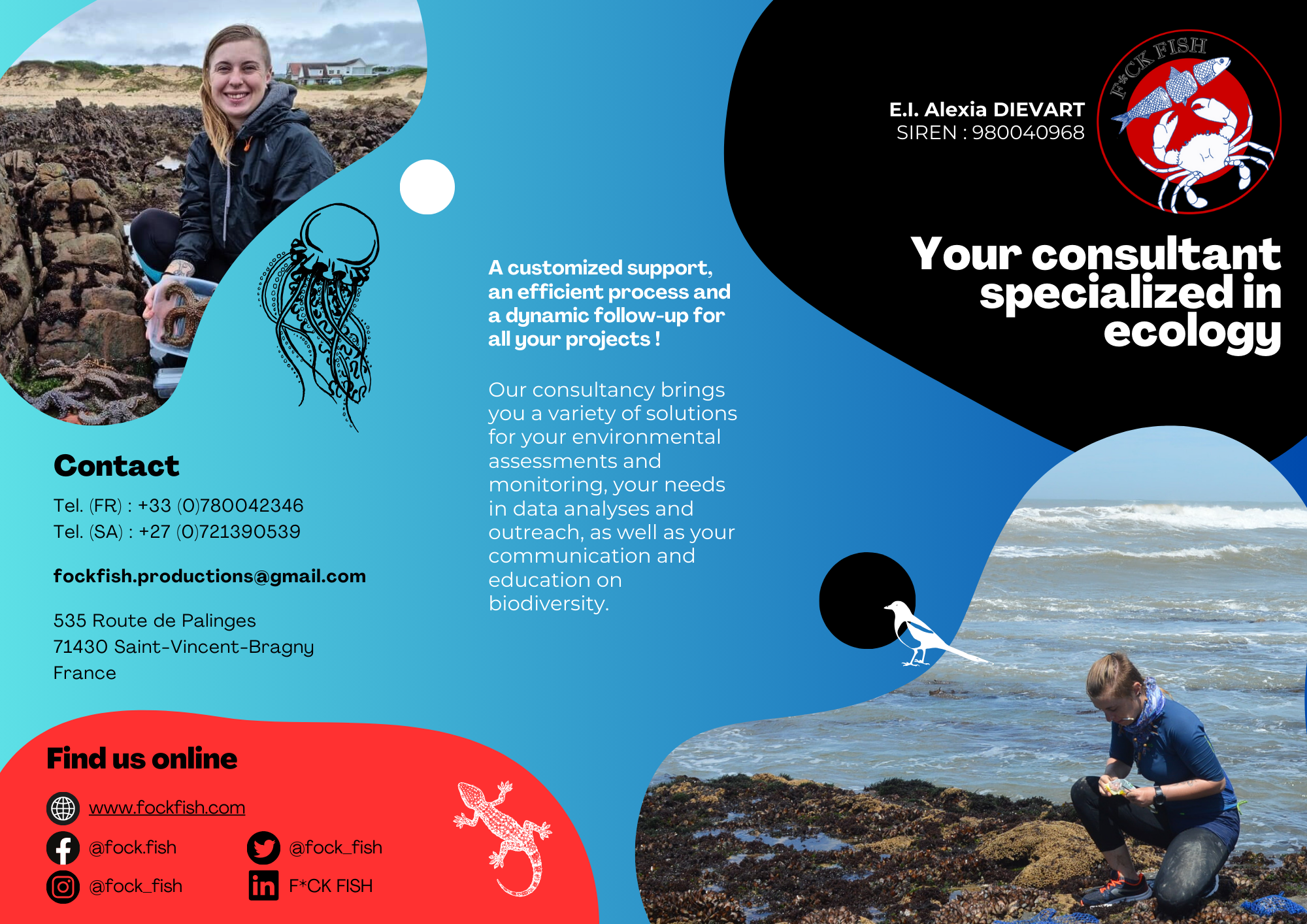 Our consultancy, F*CK FISH, specializes in the fields of biology, ecology and agricultural to bring you a variety of solutions for your environmental assessments and monitoring, your needs in data analysis and public outreach, as well as your communication and education about biodiversity.