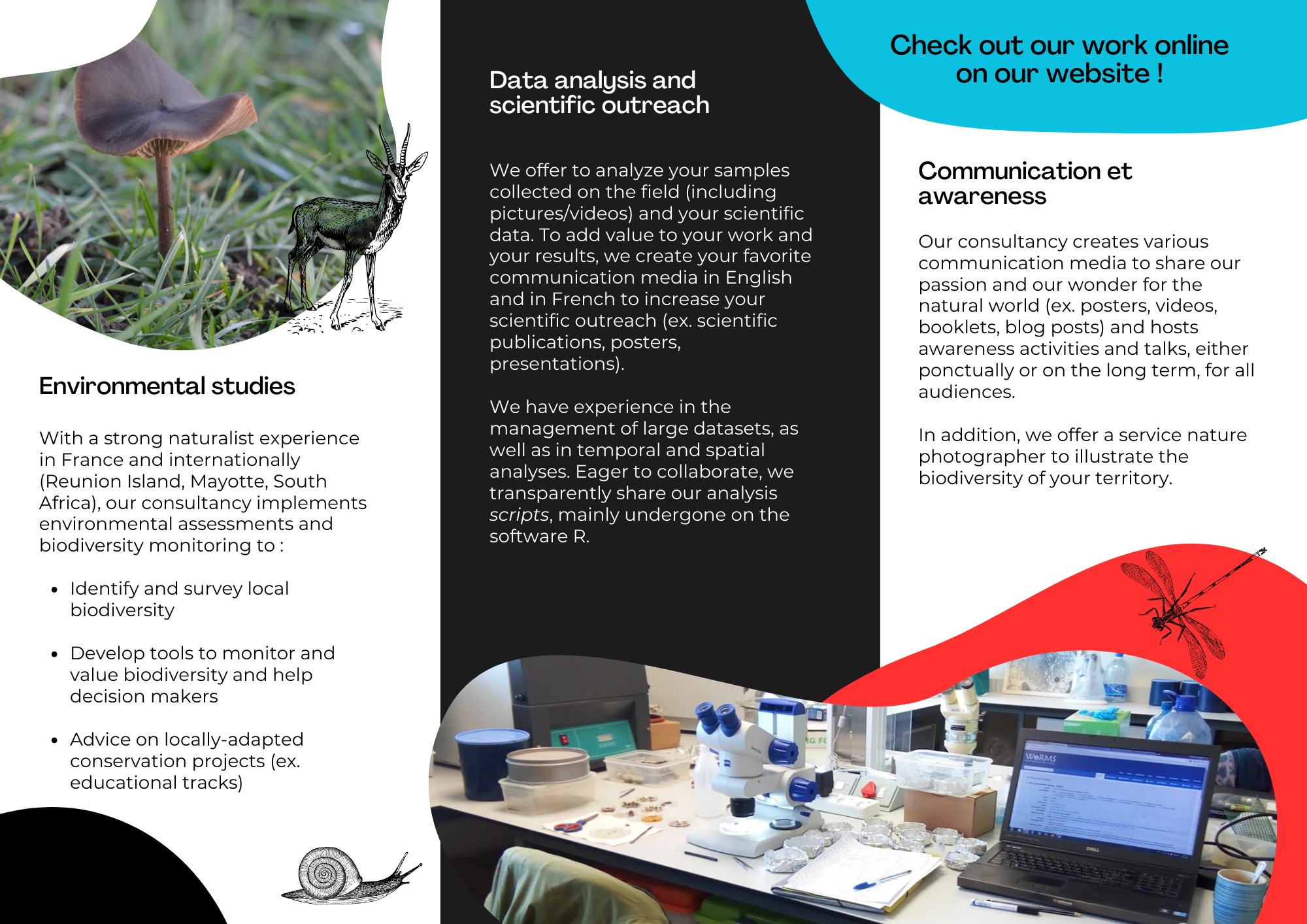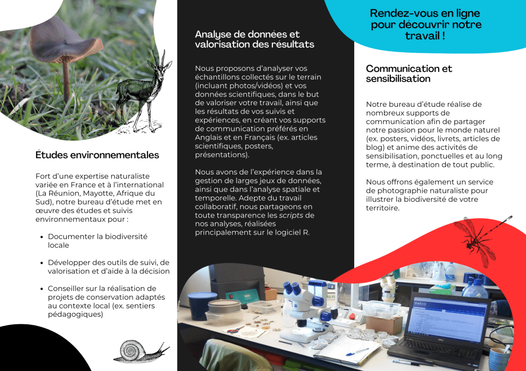 Now, I created my own environmental consultancy business ! I can’t wait to help you out on your projects related to biodiversity, from environmental surveys to scientific outreach, going through data analyses.