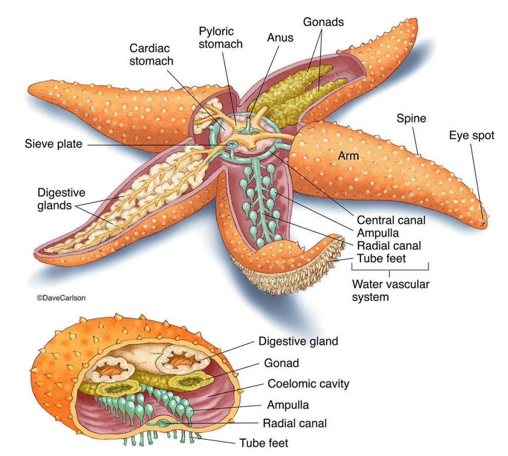 Starfish have a flattened central body which merge imperceptibly into five or more, relatively stout, projecting arms. Each arm contains its own set of respiratory, digestive and reproductive organs.